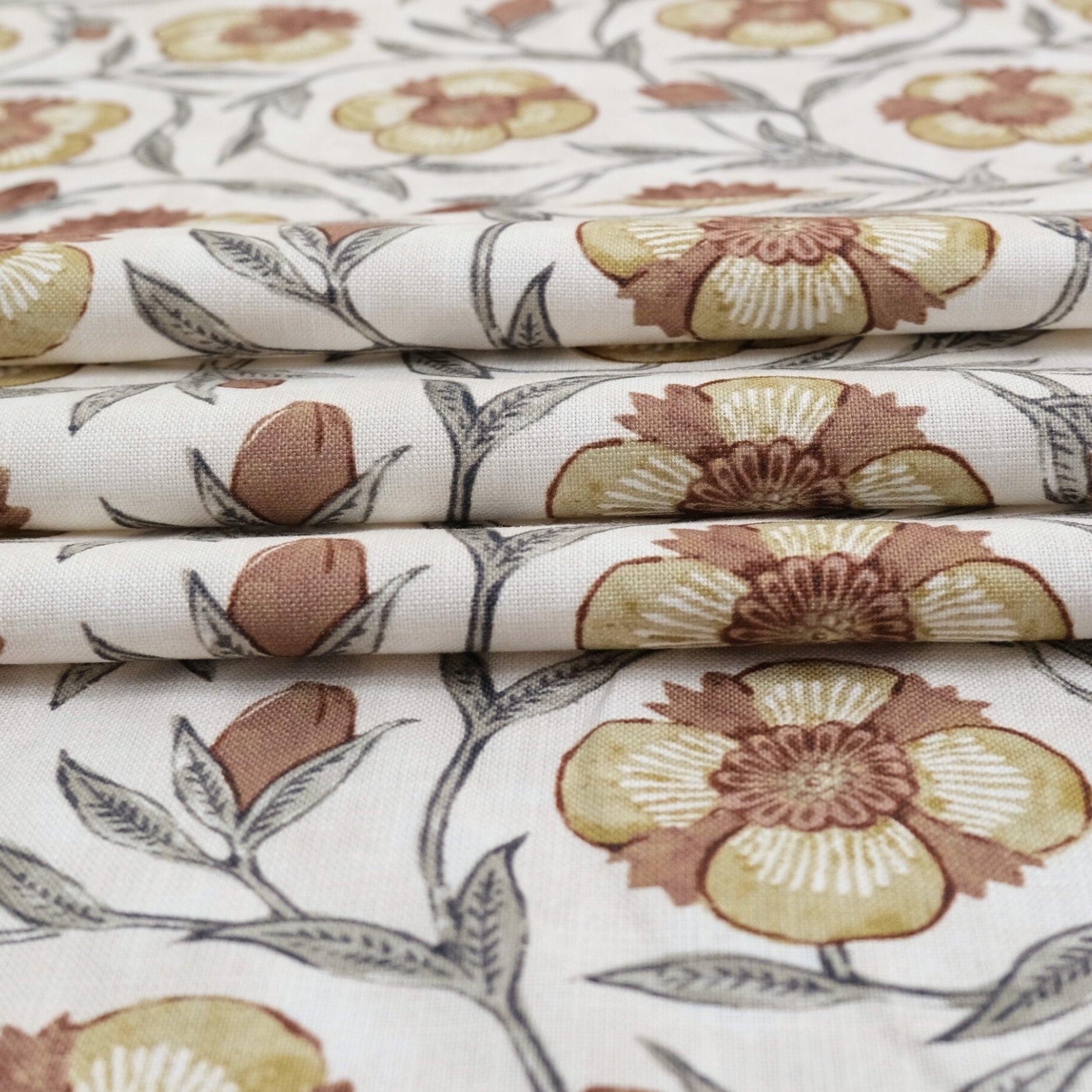 Aveline - Turmeric is a vibrant rust yellow floral print fabric, perfect for adding a rich, eclectic touch to your home decor. This designer textile, made from a blend of cotton, viscose, and linen, is ideal for window drapery or home sewing projects. With its beautiful floral pattern, this fabric enhances any interior with its timeless appeal and versatile charm.