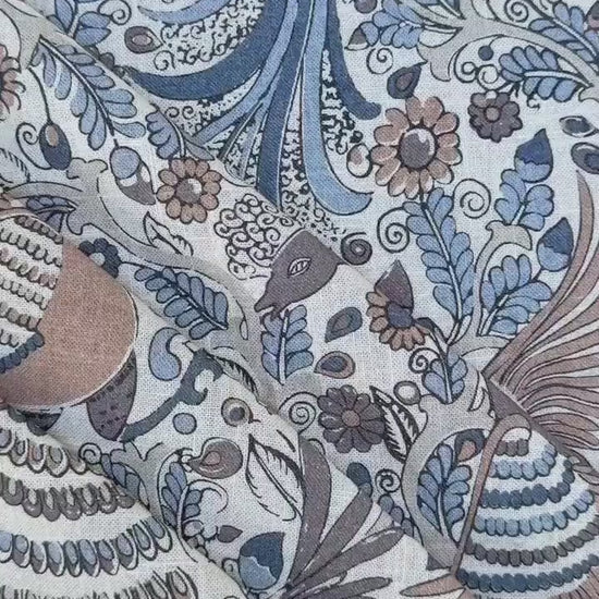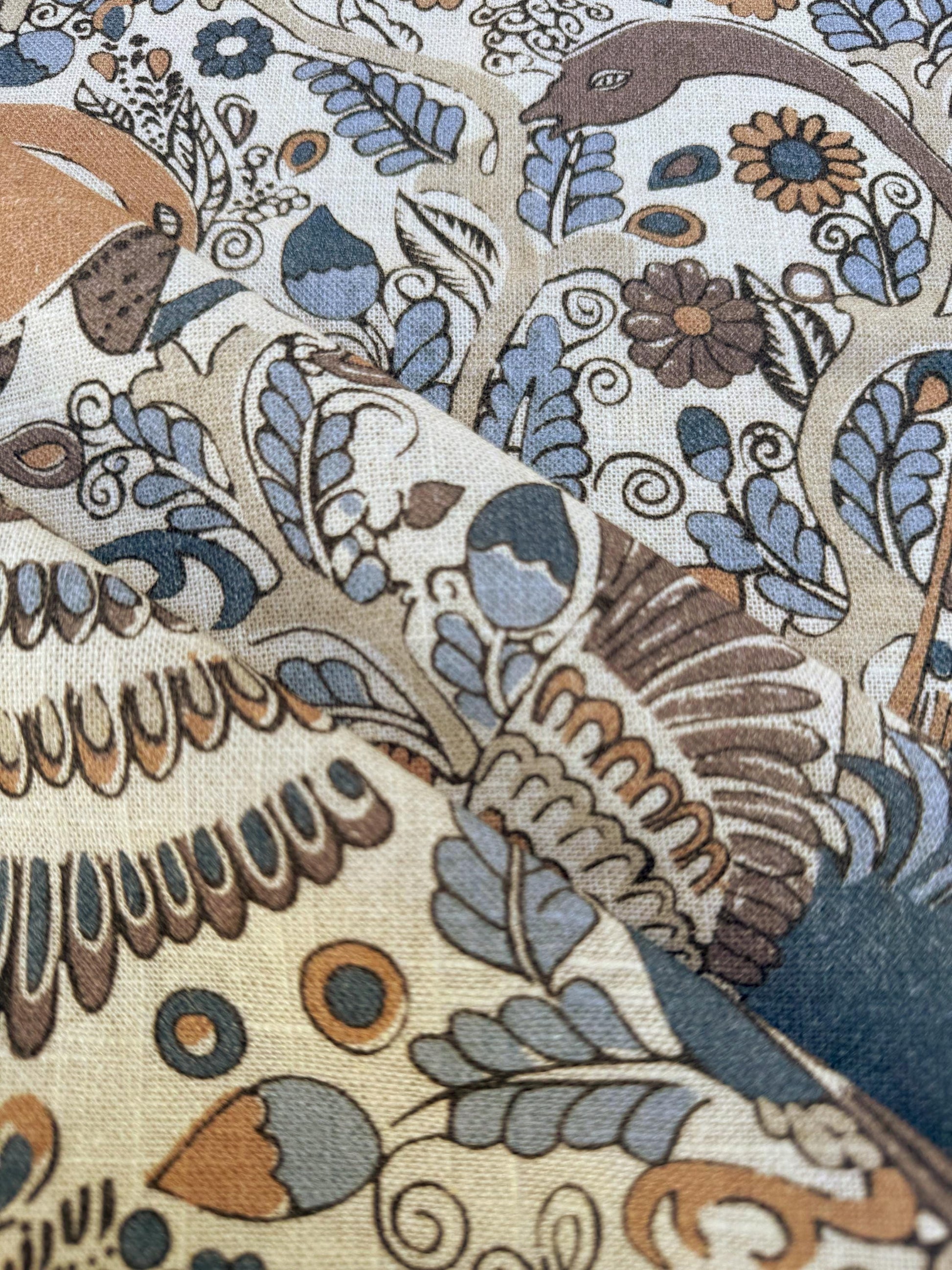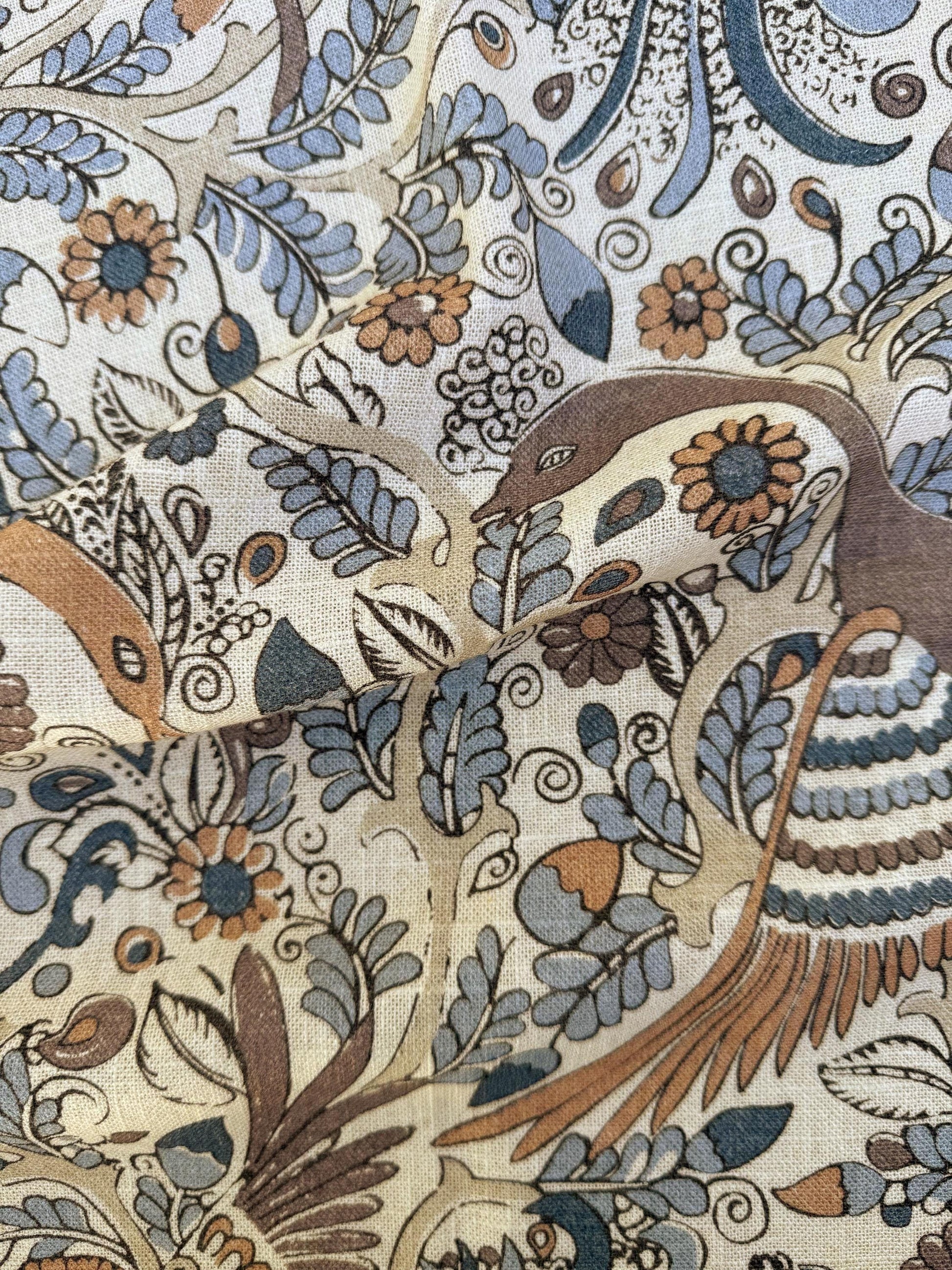 Elegant drapery weight fabric featuring teal birds with flowing tails surrounded by detailed florals and vines, inspired by William Morris style. Perfect for curtains, cushion covers, table runners, and timeless vintage-inspired home décor projects.