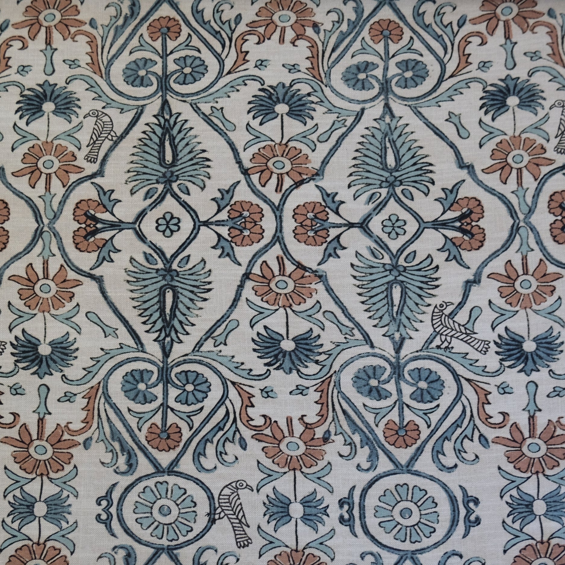 Infuse your space with charm using our Fleurish whimsical floral and bird fabric. This relaxed drapery textile features a block print-inspired vine pattern on a soft tan background, enhanced by coral, aquamarine, and French blue tones. The playful bird illustrations add a storybook feel, making it ideal for cottagecore, eclectic, or romantic interiors.
