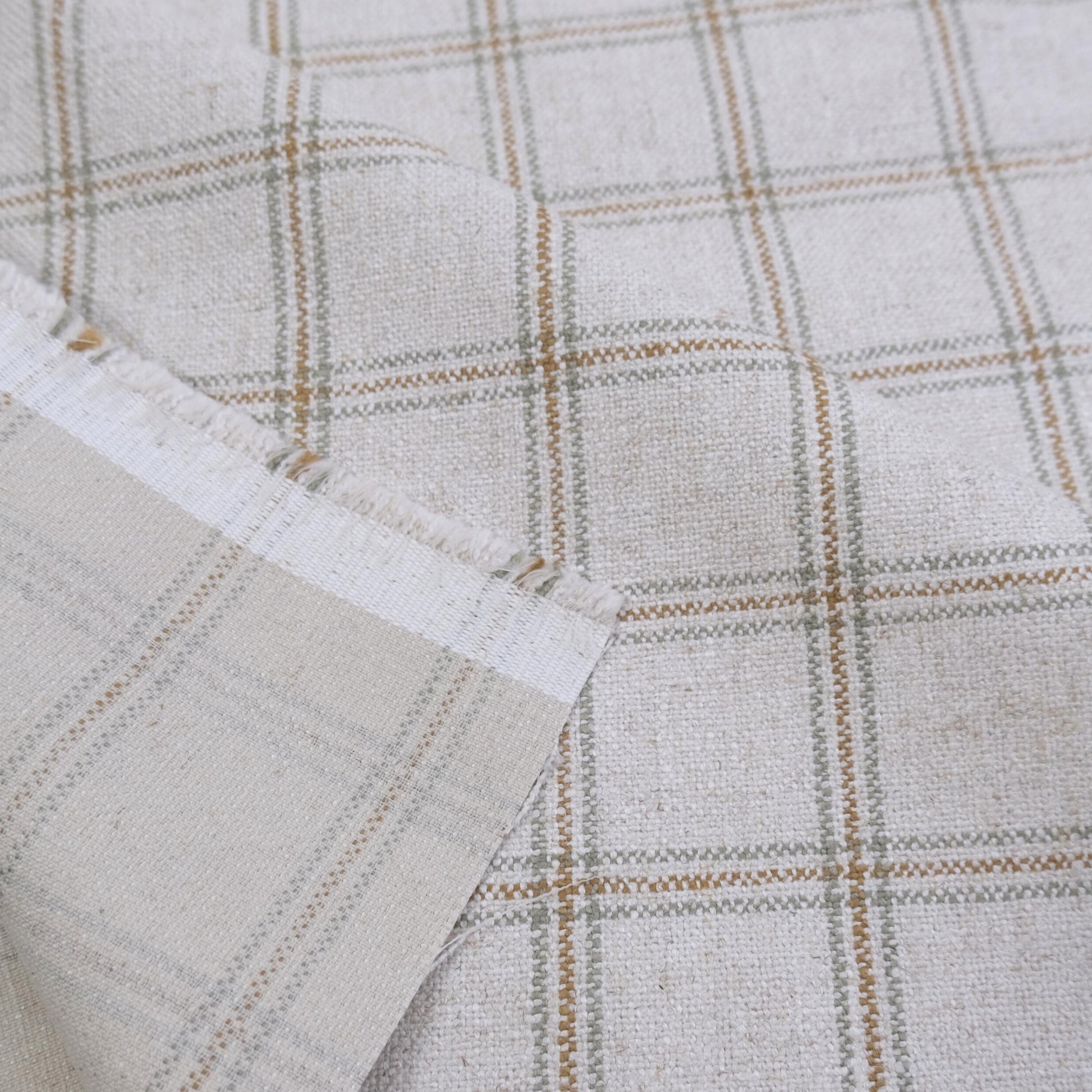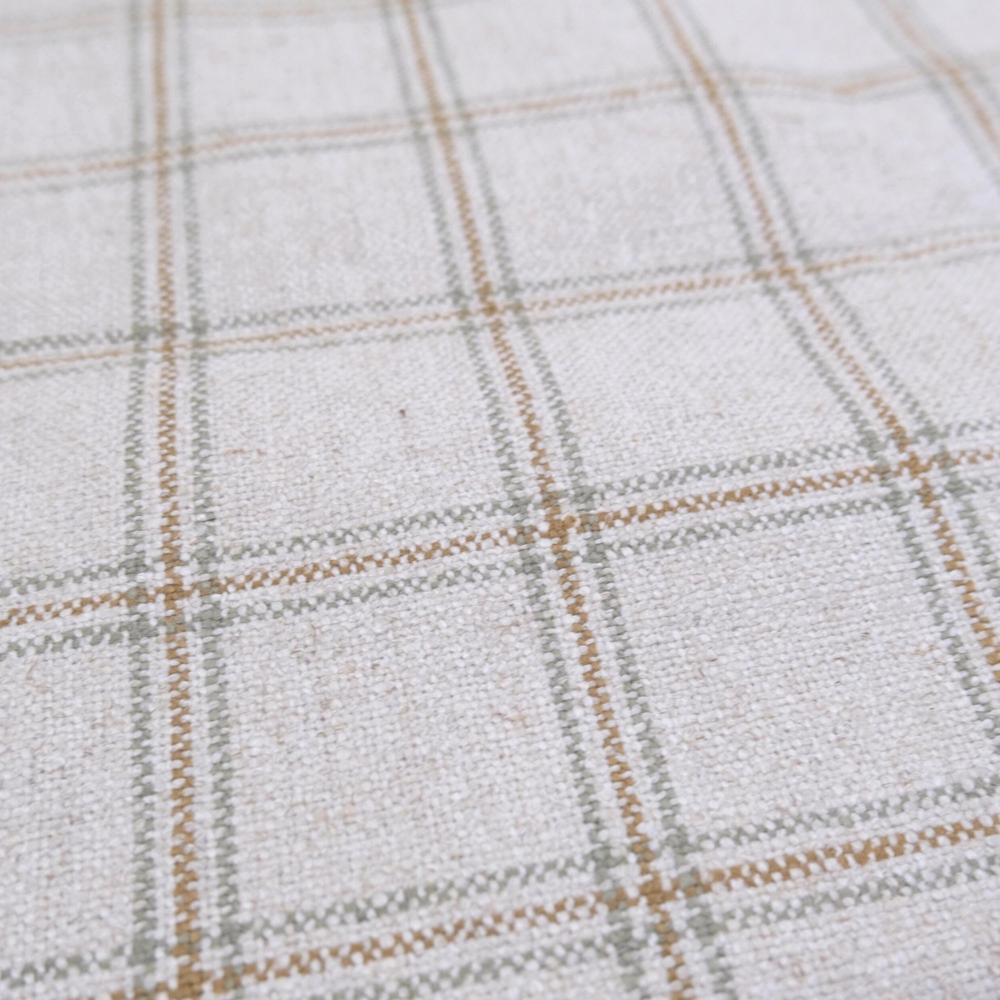 This neutral plaid fabric features a classic windowpane check in beige with soft sage and ochre accents. Its linen-look texture and tailored style make it perfect for curtains, throw pillows, or warm cottage-inspired home decor. Sold by the yard.